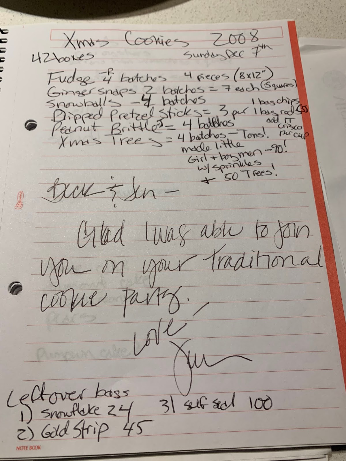 This book was started waaayyy back in 2002 (almost 20 years ago!!) the first year Jen and I did our cookie/candy boxes for clients and kids teachers. We did it all in one day - 40 boxes worth - 5 items each. The following years we started making notes: how many batches, how many each batch made, if we liked them, what day we did them, how many bags we had left for next year, who came to visit and hang out with us and of course a reminder to take the time to have a glass of wine.Every year around mid November I go to my bookshelf and pull out this precious binder. I look at prior years. We decide when and where and what we are going to make. We have gotten more agile over the years - we don't do it in one day anymore - generally 1 person tackles peanut brittle and the other does the saltine toffee or fudge- then we get together on a day and mix and bake off all the cookies and package them up - counting the bags over and over to make sure we have the correct amount to fill all the boxes. For 17 years we managed with our busy lives to carve out time and space to make this happen. Then 2020 happened and we decided we had to do it without each other. It was sad - I at least had my helper Sarah - but it wasn't the same.